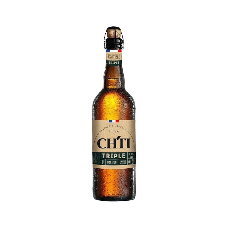 Ch ti Triple è una Bière de Garde ad alta fermentazione che interpreta con eleganza lo stile delle Triple belghe, fondendo tradizione fiamminga e raffinatezza brassicola Nel bicchiere sfoggia un colore dorato carico, impreziosito da riflessi ambrati e da una schiuma bianca, ricca e persistente Al naso regala un bouquet complesso e seducente: note fruttate di pera matura, albicocca e banana si intrecciano a sfumature di miele, spezie dolci e un leggero tocco pepato, risultato di lieviti selezionati Il sorso è pieno, caldo e vellutato: la ricca base maltata avvolge il palato con richiami di biscotto e caramello chiaro, mentre l amaro delicato dei luppoli nobili equilibra la dolcezza e guida verso un finale secco e armonioso La gradazione alcolica importante è ben integrata e regala una piacevole sensazione di calore, mantenendo un ottima bevibilità Servita a 9-11 °C, accompagna con maestria piatti robusti come arrosti di carni bianche, formaggi stagionati, selvaggina in umido e dessert a base di frutta secca Una birra intensa e sofisticata, che racchiude l essenza della grande tradizione brassicola del Nord della Francia.