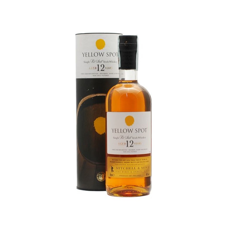 L Irish Whiskey Yellow Spot 12 Y.O è un single pot still invecchiato in botti di rovere americano ex-bourbon, sherry e malaga Ha un aroma dolce e fruttato, con note di albicocca, vaniglia e spezie Al palato, è morbido e cremoso, con un sapore intenso di malto, caramello e frutta secca, bilanciato da una piacevole speziatura Il finale è lungo e persistente, con note di legno, cioccolato e spezie Perfetto da gustare liscio o con un paio di cubetti di ghiaccio, rappresenta una scelta ideale per gli amanti dei whisky dal carattere complesso e raffinato