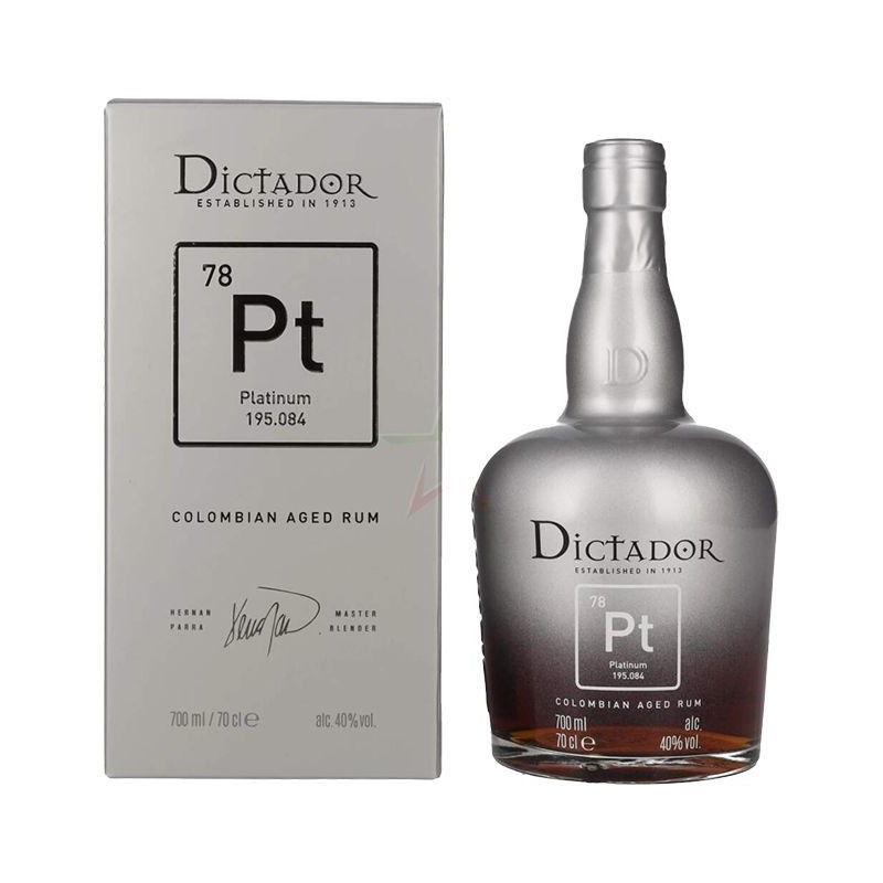 Rum Dictador XO Platinum è un rum colombiano di altissima gamma, creato con miele vergine di canna da zucchero e invecchiato con metodo Solera in botti di rovere ex-bourbon e sherry Alla vista si presenta con un colore ambrato intenso e riflessi dorati Al naso sprigiona aromi complessi di cacao, caffè, caramello e leggere note speziate Al palato è vellutato, con dolcezza equilibrata e un finale lungo e persistente che esalta la sua eleganza Con una gradazione alcolica di 40% vol e il suo packaging raffinato, è ideale per degustazioni premium o come regalo esclusivo.