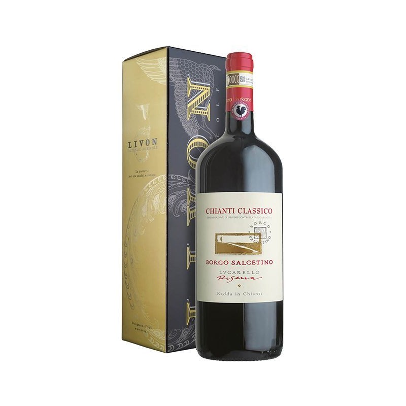 Il Chianti Classico Riserva DOCG Borgo Salcetino Lucarello Magnum 1.5 L è un vino che esprime con eleganza la tradizione del territorio di Lucarelli, nel cuore storico del Chianti Ottenuto da una selezione accurata di Sangiovese con piccole aggiunte di vitigni autoctoni, affina a lungo in legno, sviluppando una personalità complessa e armoniosa Al calice si presenta con un colore rubino profondo; al naso emergono note di ciliegia matura, prugna, viola appassita e spezie dolci, accompagnate da accenni di tabacco e leggera tostatura In bocca è strutturato, avvolgente e sostenuto da tannini fini, con una freschezza tipica del territorio che dona equilibrio e lunghezza La versione Magnum ne esalta la capacità evolutiva, rendendolo ideale per le occasioni importanti o per una lunga conservazione Perfetto con carni rosse, selvaggina e formaggi stagionati.